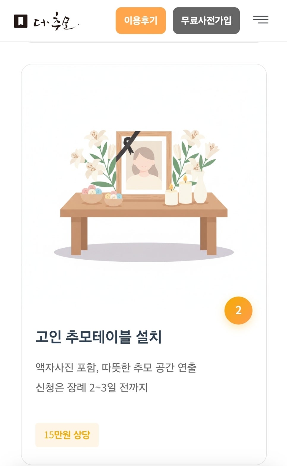 더추모 무료 사전가입은 장례 발생 전 미리 가입해 두면(사전 가입비용 0원), 장례 시점에 50만 원 상당의 프리미엄 서비스를 무료로 제공받을 수 있는 제도입니다.